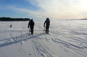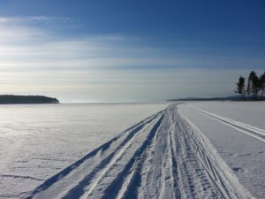 Vintertid har vi ypperliga vandringsstråk utmed isen där fina ”vägar” finns att gå på där skotrar dragit fram. Dock är det DITT ansvar att säkerställa att isen är tjock nog men ett tips är att hålla strandkanten där isen ligger på sjöbotten.